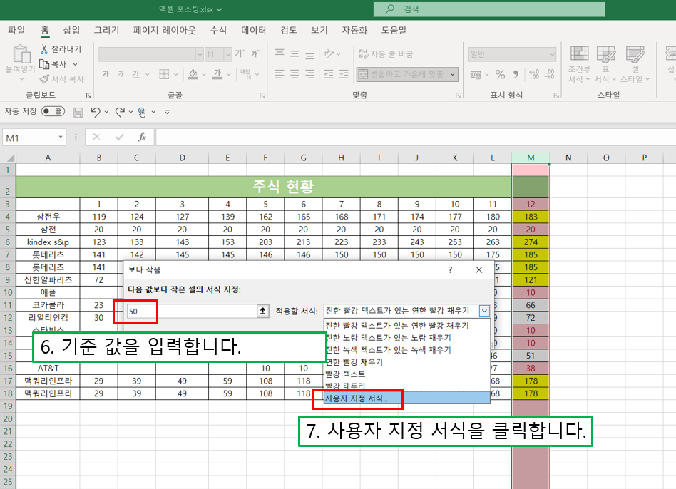 1) 조건부 서식을 지정할 열을 선택합니다. 저는 M열에서 주식 수가 50 미만인 열들의 서식을 노란색 배경으로 바꿔보려고 합니다.