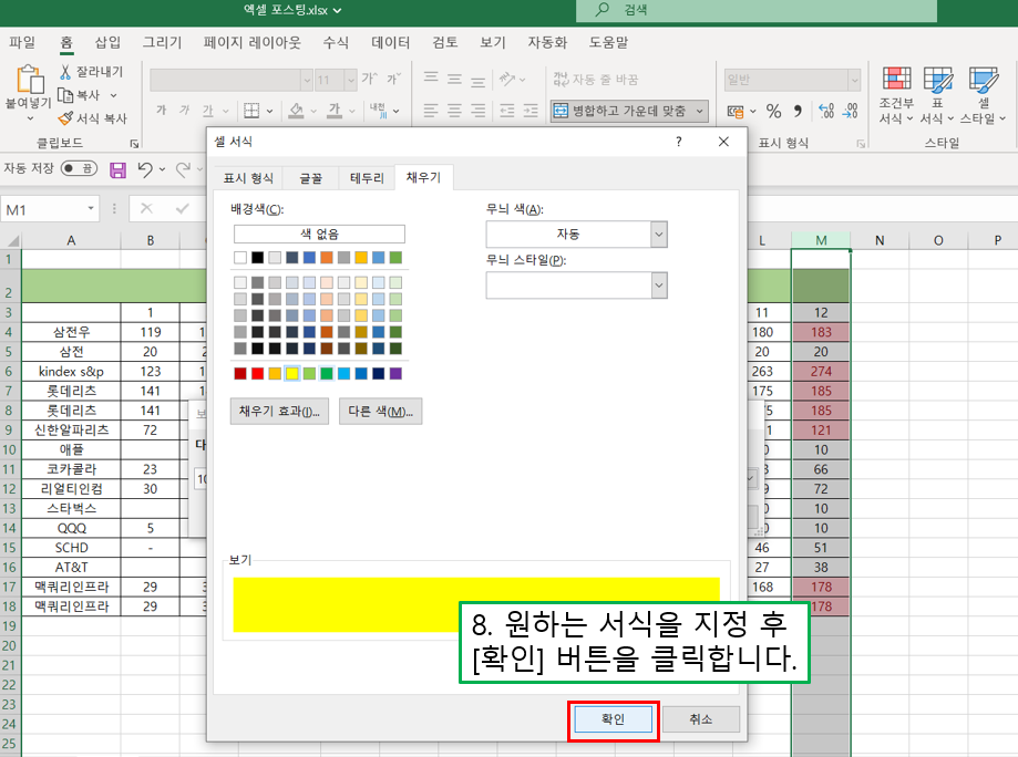 8) 원하는 서식을 지정 후 [확인] 버튼을 클릭합니다. 저는 채우기에서 노란색 채우기를 지정했습니다.