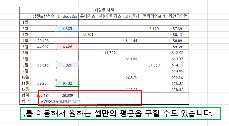 ,를 이용해 원하는 셀만의 평균 값을 구할 수도 있습니다.