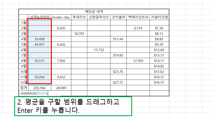 2. 평균을 구하고 싶은 셀을 드래그하고 ENTER키를 눌러줍니다.