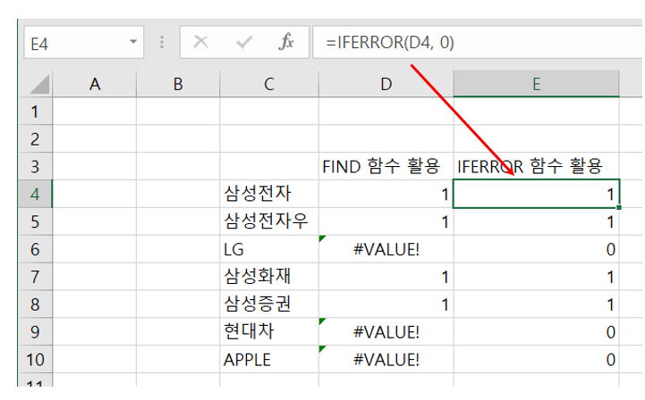 FIND 함수를 활용해 왼쪽 회사 명에 "삼성"이라는 글자가 있는지 (어디에 위치해 있는지) 찾아주었습니다.
