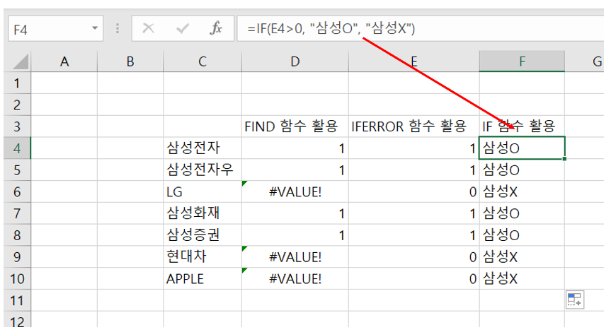 이번엔 IF 함수를 활용해서 해당 셀의 값에 따라 삼성 회사가 맞는지 아닌지 구분을 해주었습니다.