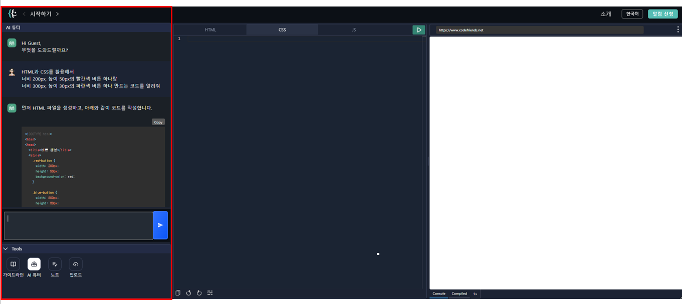 그리고 코드 프렌즈에는 언제 어디서든지 도움을 받을 수 있는 AI 코딩 튜터가 있습니다.