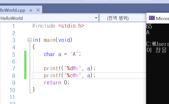 8번째 줄에 %c로 출력했을 때 A가 나오는 것은 이해가 되지만