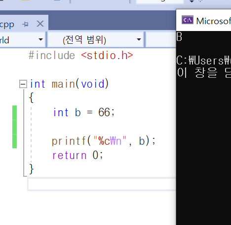 b를 정수형으로 선언하고 66을 대입한 뒤 문자형으로 출력을 하면