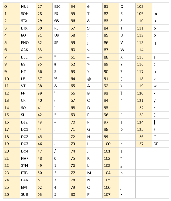 0~127까지의 숫자를 영문자나 문자, 숫자 등에 대응시킨 것입니다.