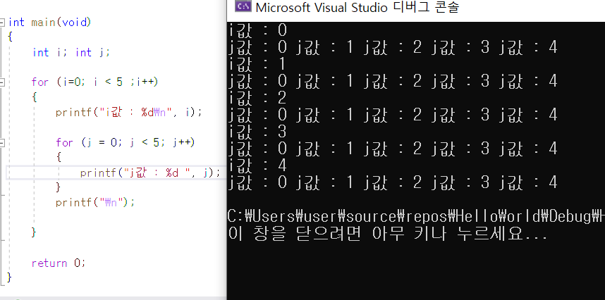 이후 j=0일 때부터 j가 5보다 작을 때까지 j값을 하나씩 증가시키면서 중괄호 안에 내용을 실행시킵니다.