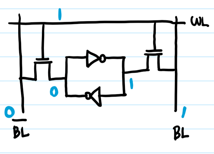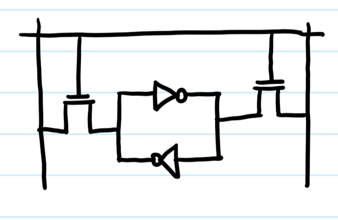 한 개의 bit를 저장하기 위해 그림과 같이 여섯 개의 트랜지스터가 필요합니다.