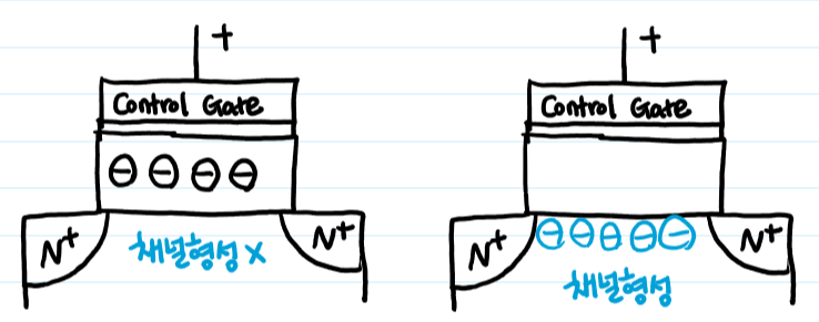 전자가 왼쪽 그림처럼 저장이 되어 있으면 전기장에 간섭을 일으켜 채널이 형성되지 않습니다.