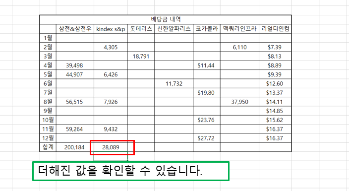즉 =SUM(E6,E9,E12,E15)와 같이 입력하면 E6+E9+E12+E15의 합산이 나타나게 됩니다.