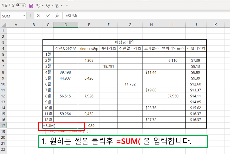 저는 D17셀을 선택 후 =SUM( 을 입력했습니다.